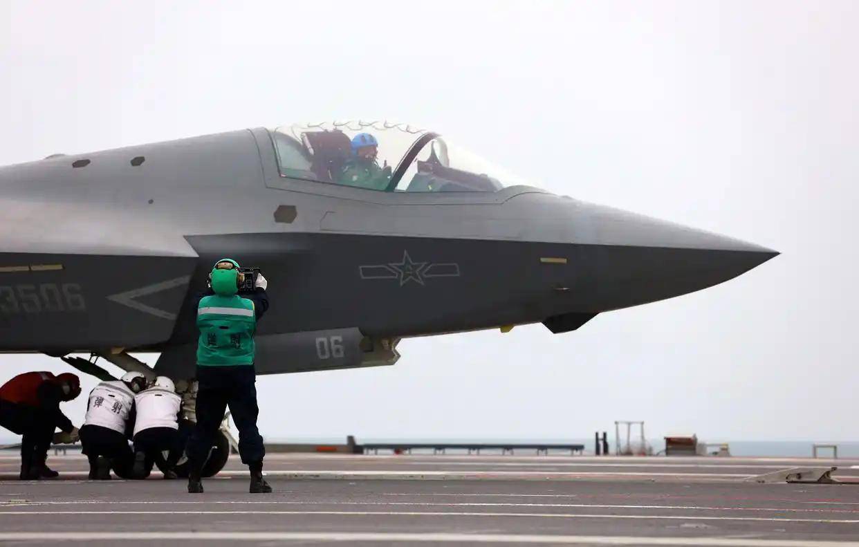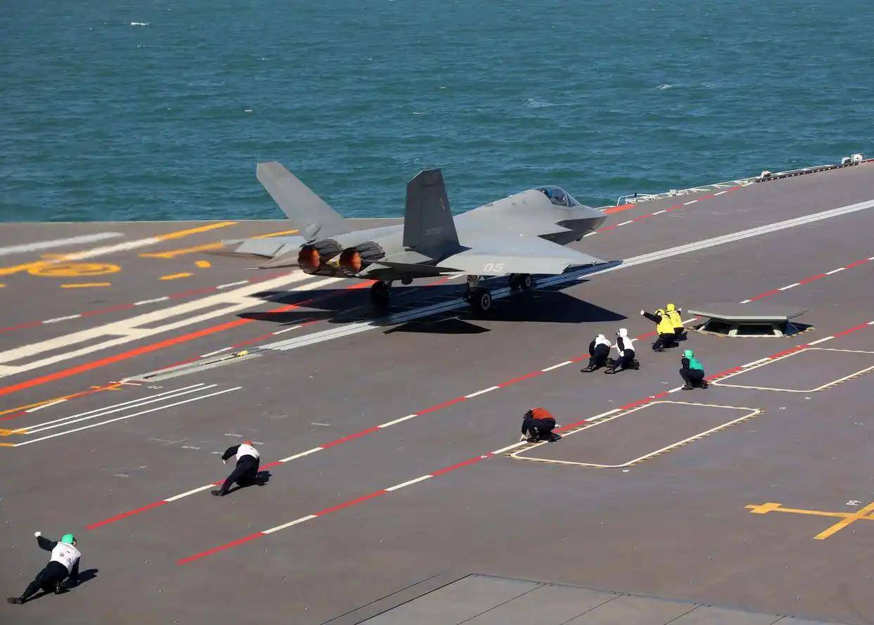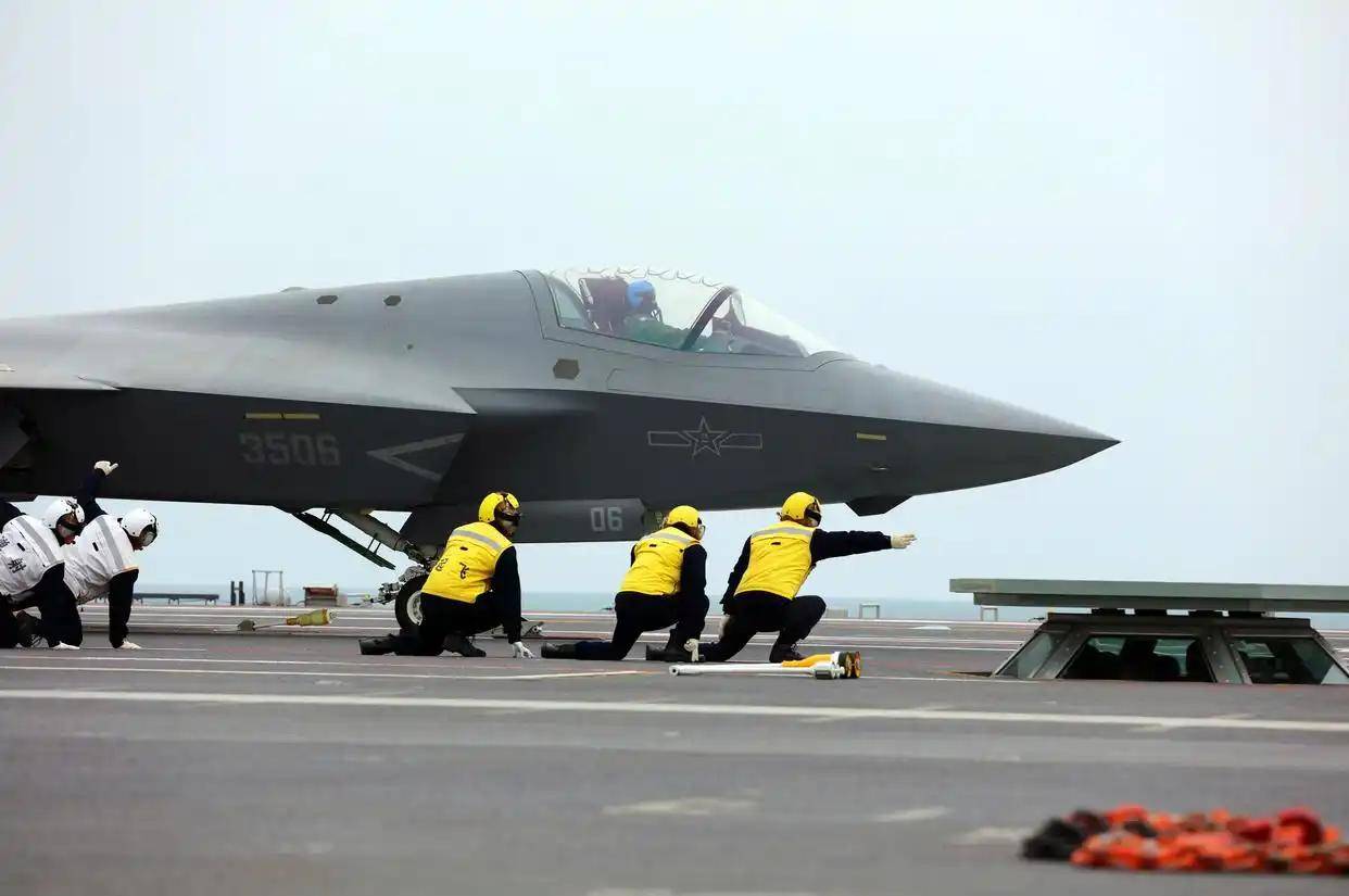 歼-35舰载战斗机在海军福建舰开展触舰复飞训练。李唐 摄