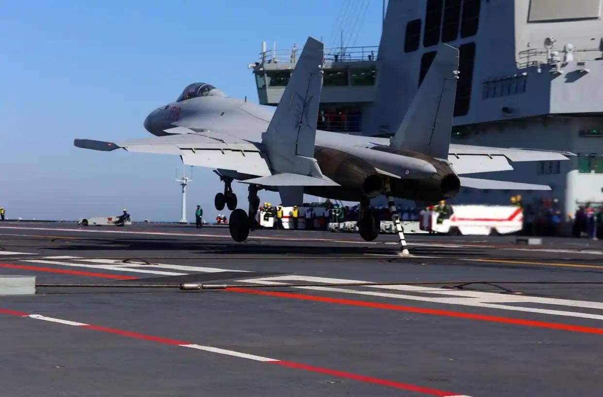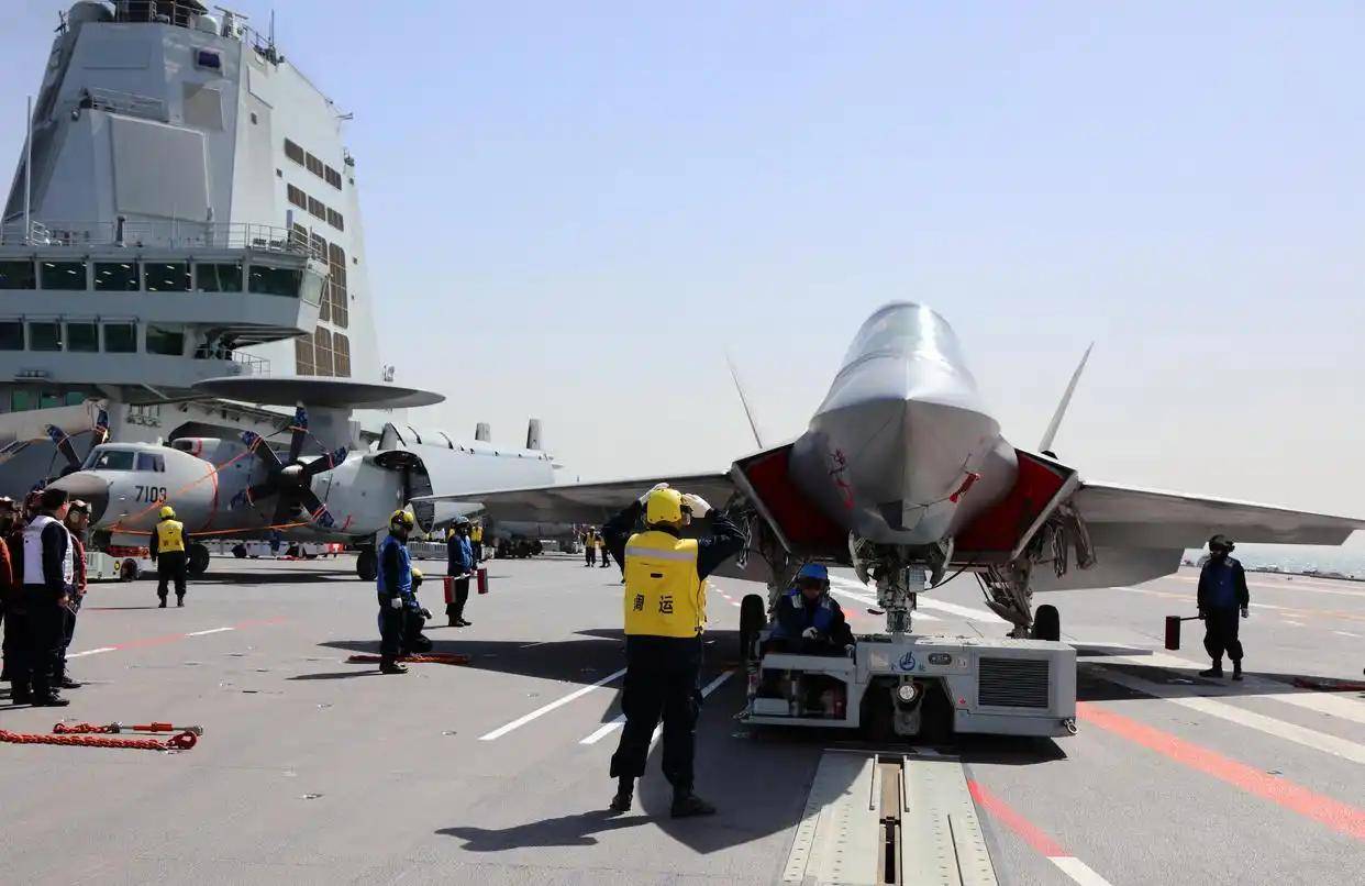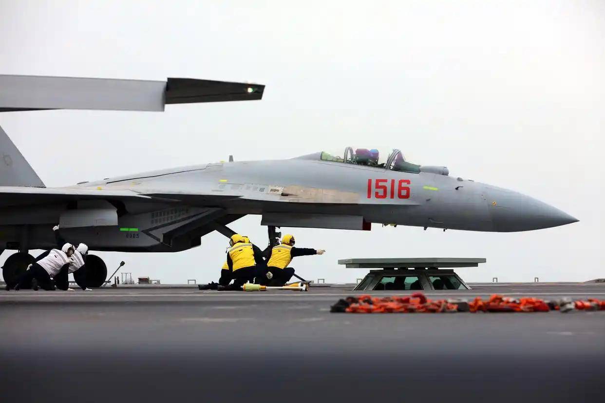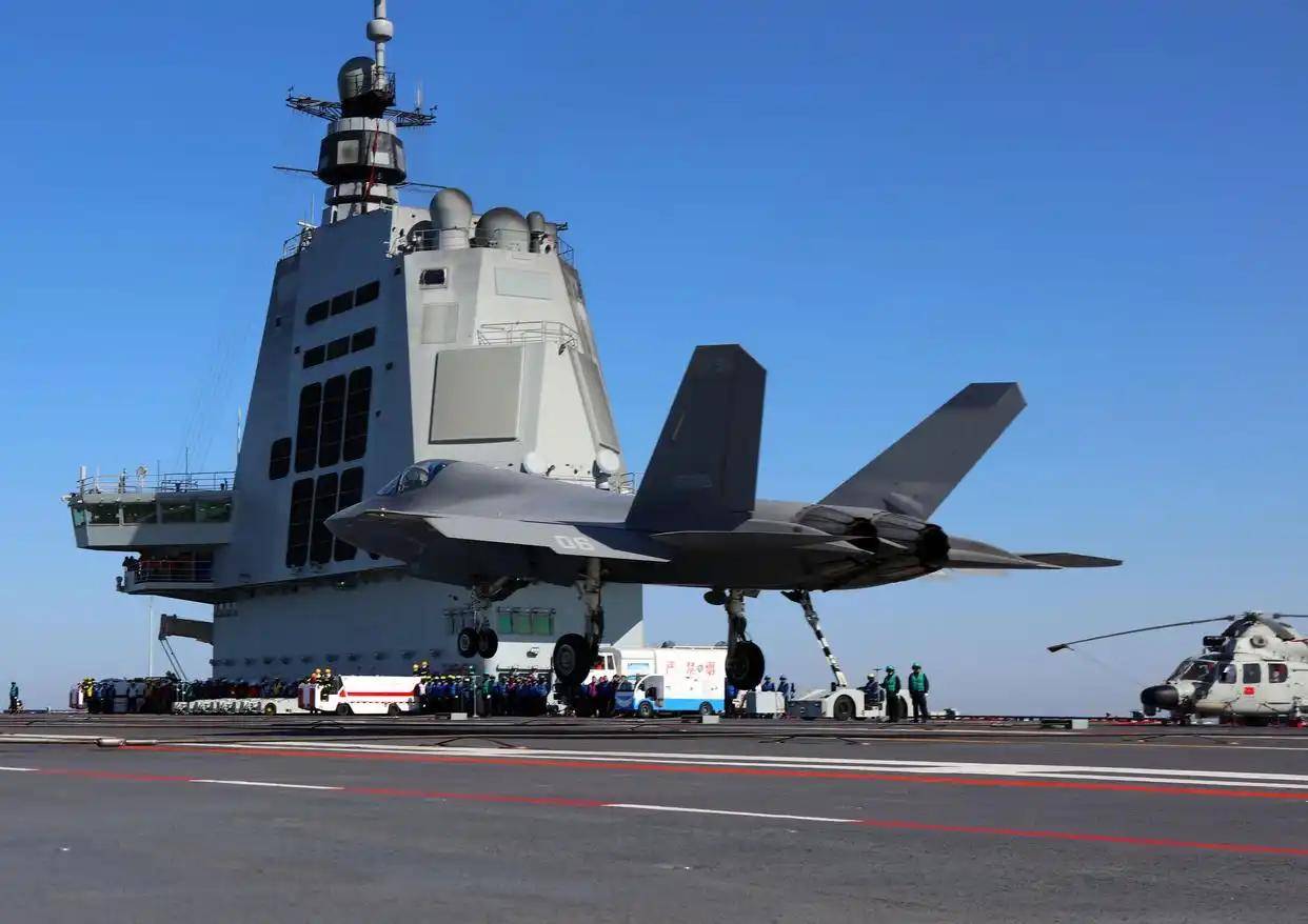 歼-35舰载战斗机在海军福建舰开展触舰复飞训练。李唐 摄