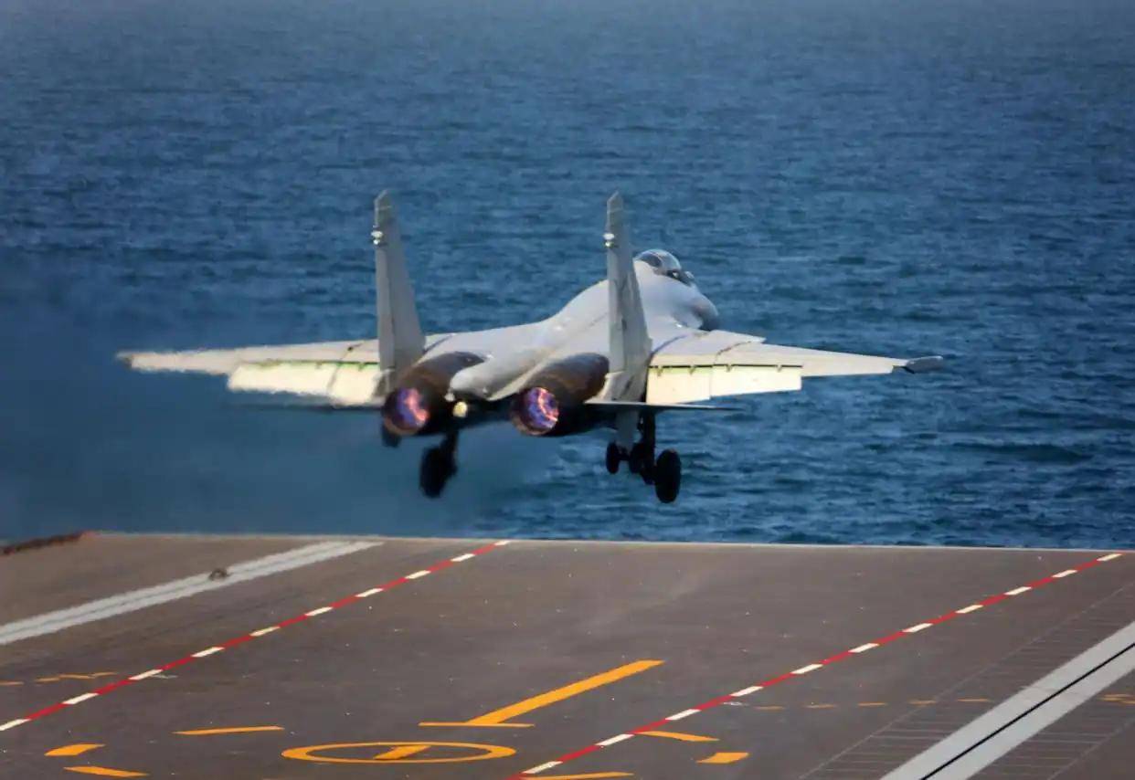 歼-15T舰载战斗机在海军福建舰阻拦着舰。李唐 摄