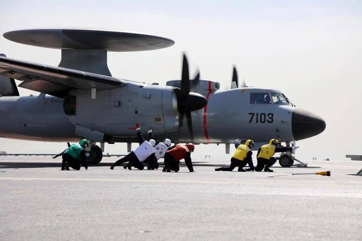 空警-600舰载预警机在海军福建舰电磁弹射起飞前,放飞小组在引导战机弹射入位。李唐 摄