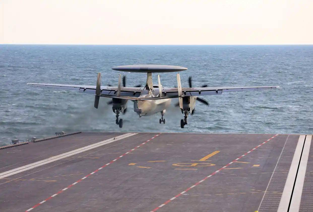 空警-600舰载预警机在海军福建舰阻拦着舰。这是飞机着舰前一瞬间。李唐 摄